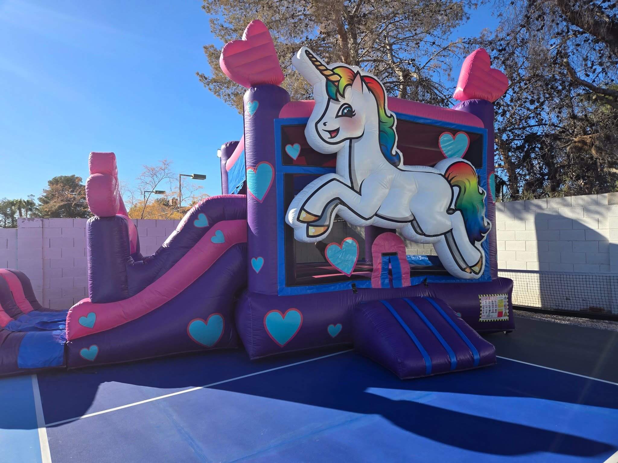 This unicorn bounce house is bursting with rainbow colors and fairytale fun—perfect for little dreamers. With strong, safe walls and an easy-peasy setup, it’s all giggles, glitter, and good times from the first bounce to the last!